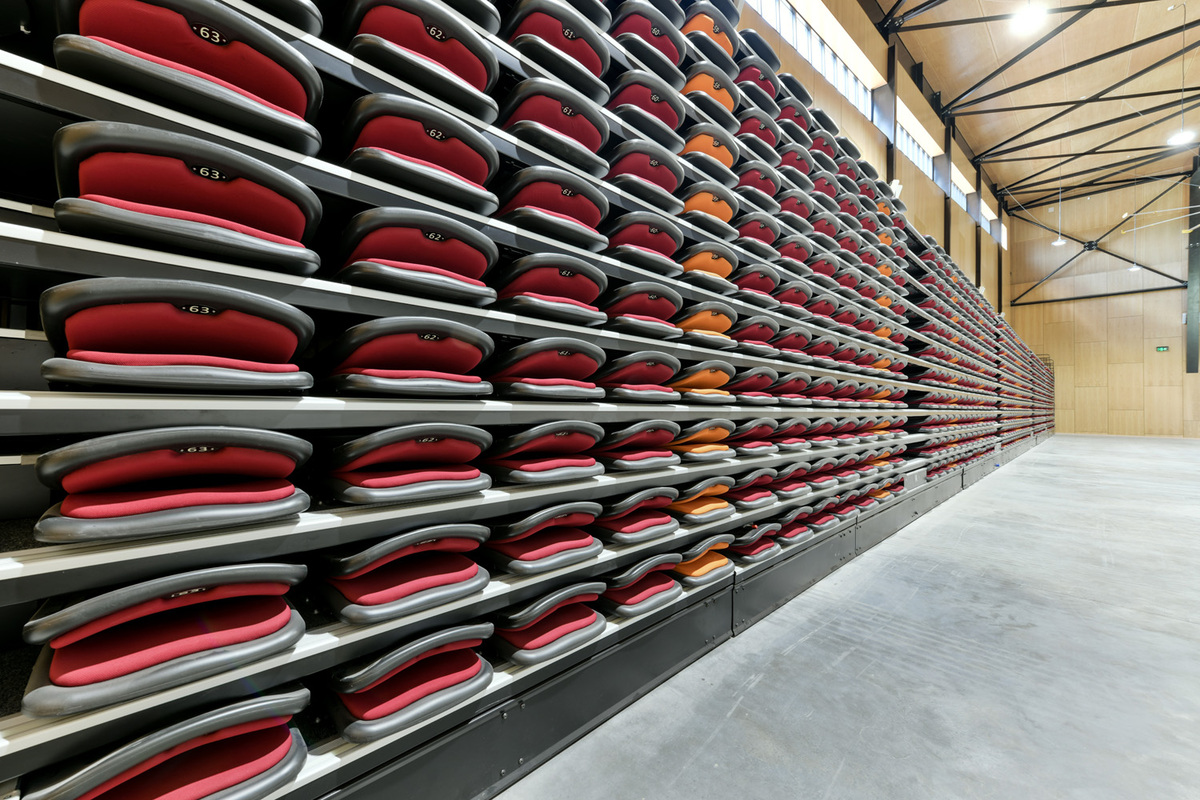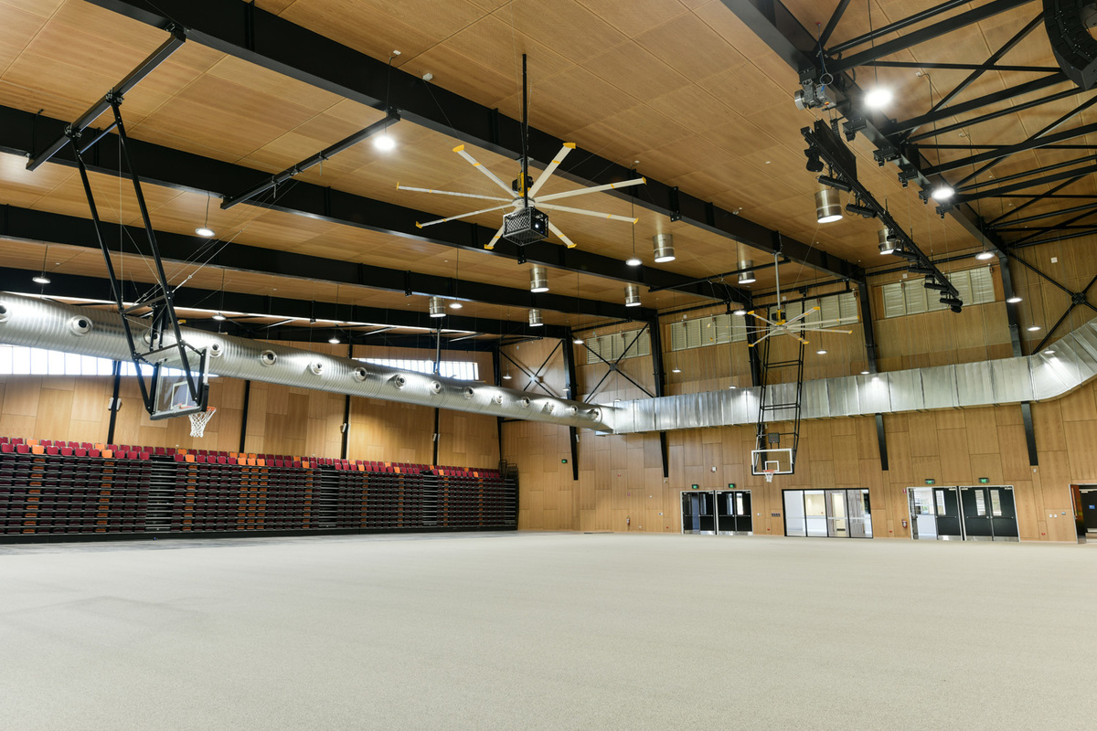Fully retractable seating for adds to the versatility of the centre. Expanded, the retractable seating for 768 allows elevated viewing of the sports court. For stage events, additional floor level seats are installed over removable carpet tiles covering the timber sports floor, greatly adding to the versatility of the centre.