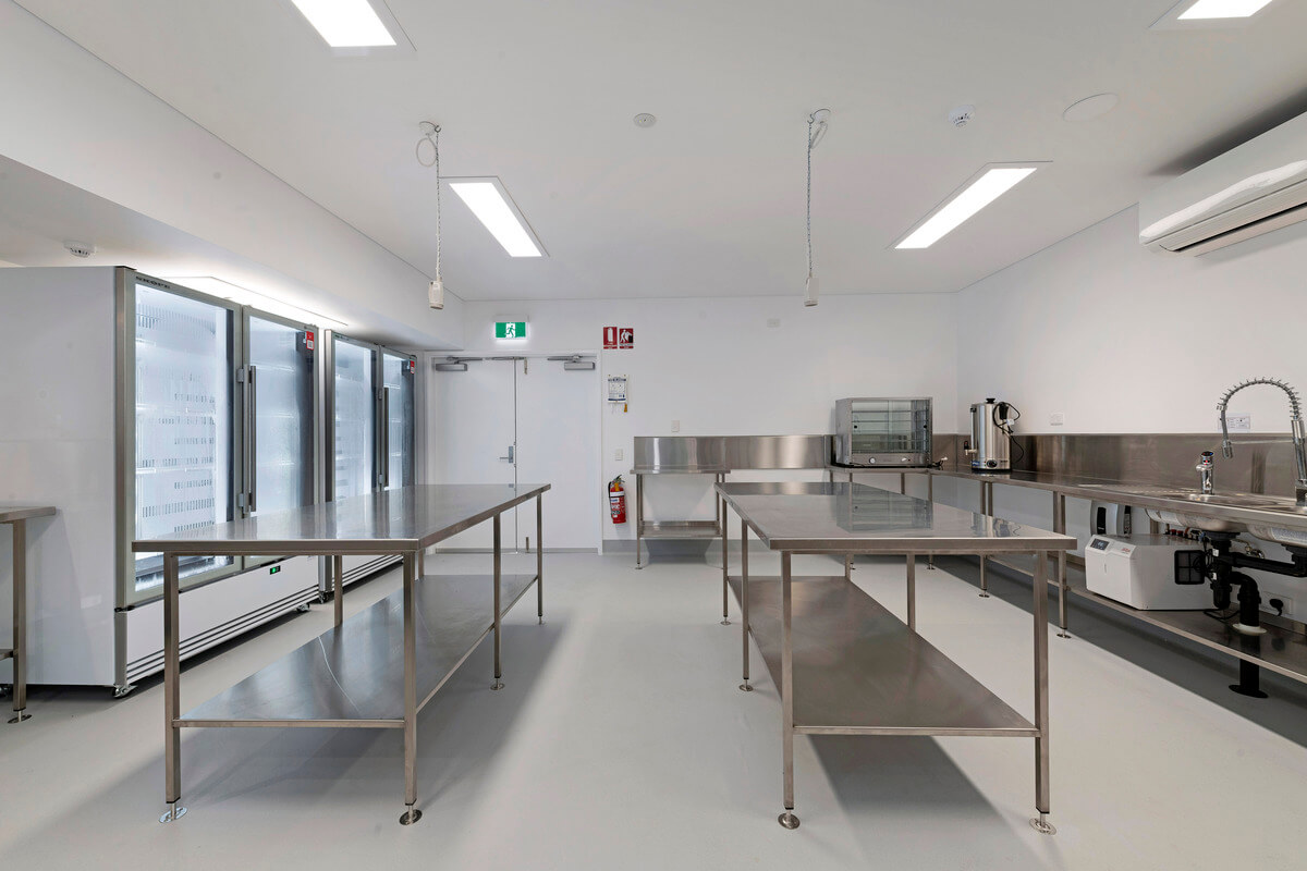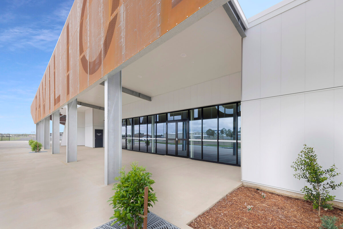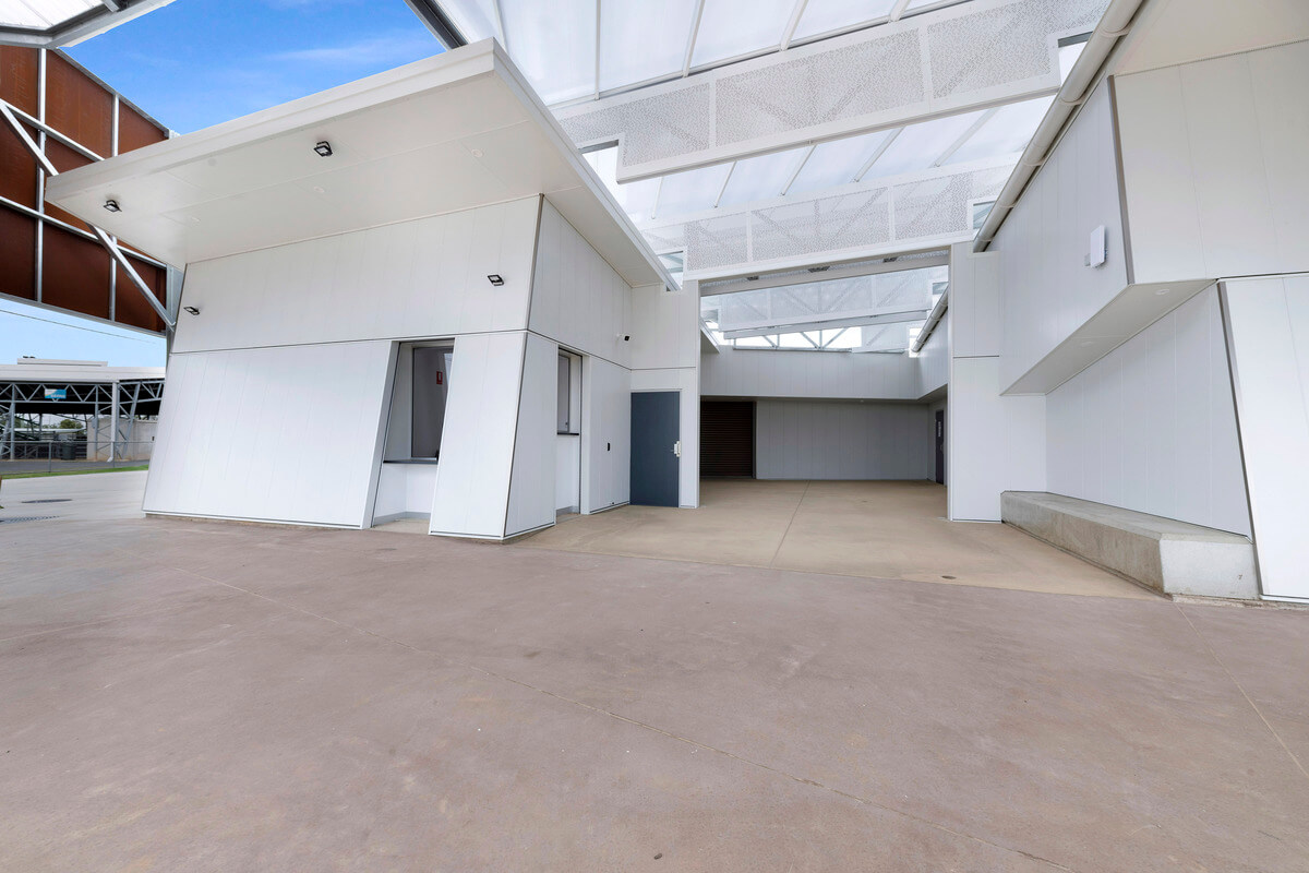 The ceiling of the Main Pavilion which was formally a Colorbond-clad steel framed structure, has been lined with perforated custom orb colorbond sheeting. A new concrete slab was poured, increasing the floor height by 200mm. Internally, the walls were lined with Cemintel Territory cladding, new external colorbond wall cladding was installed, and aluminium joinery was introduced to some of the existing openings