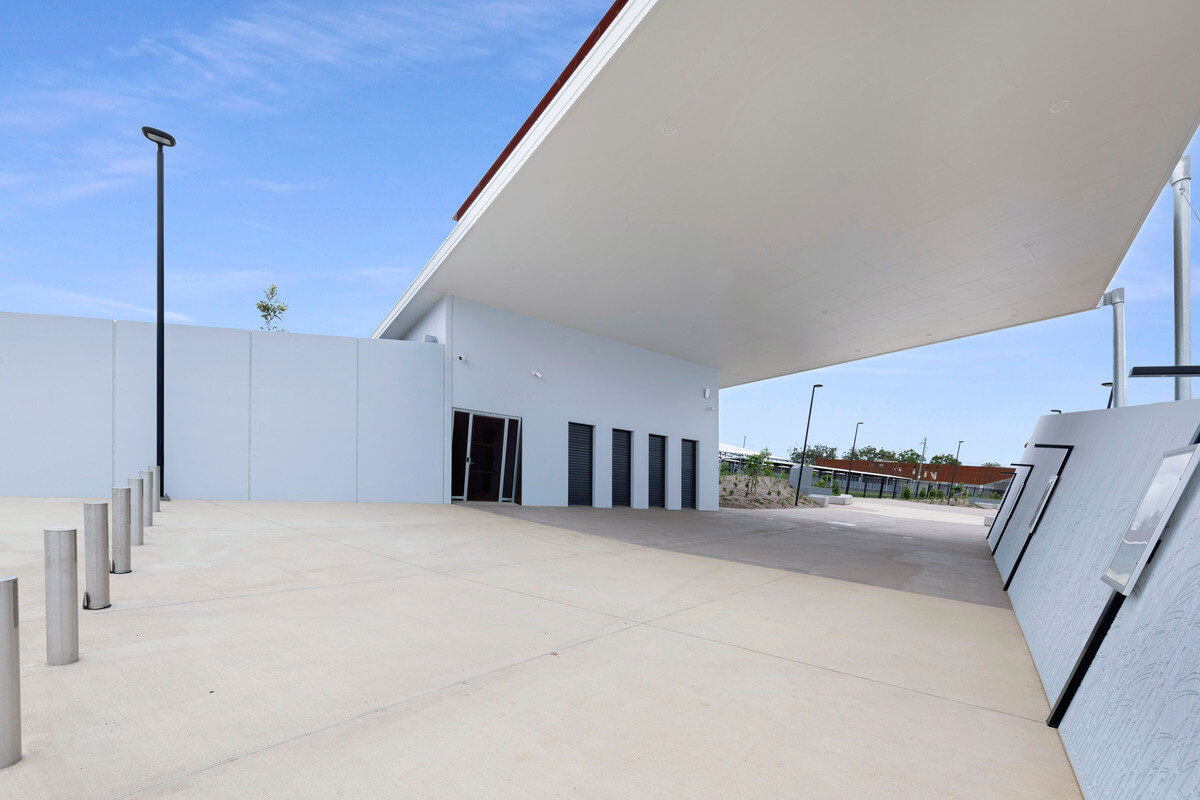 Construction involved a new Entry Plaza containing Ticketing Booths, Meeting Room, Office and Store Room. Concrete tilt panels were used in the construction of the Entry Plaza, with a high skillion roof joining the Plaza to a pre-cast concrete retaining wall opposite the ticketing area. A cane pattern adorns the precast concrete retaining wall panels upon which illuminated notice boards are mounted