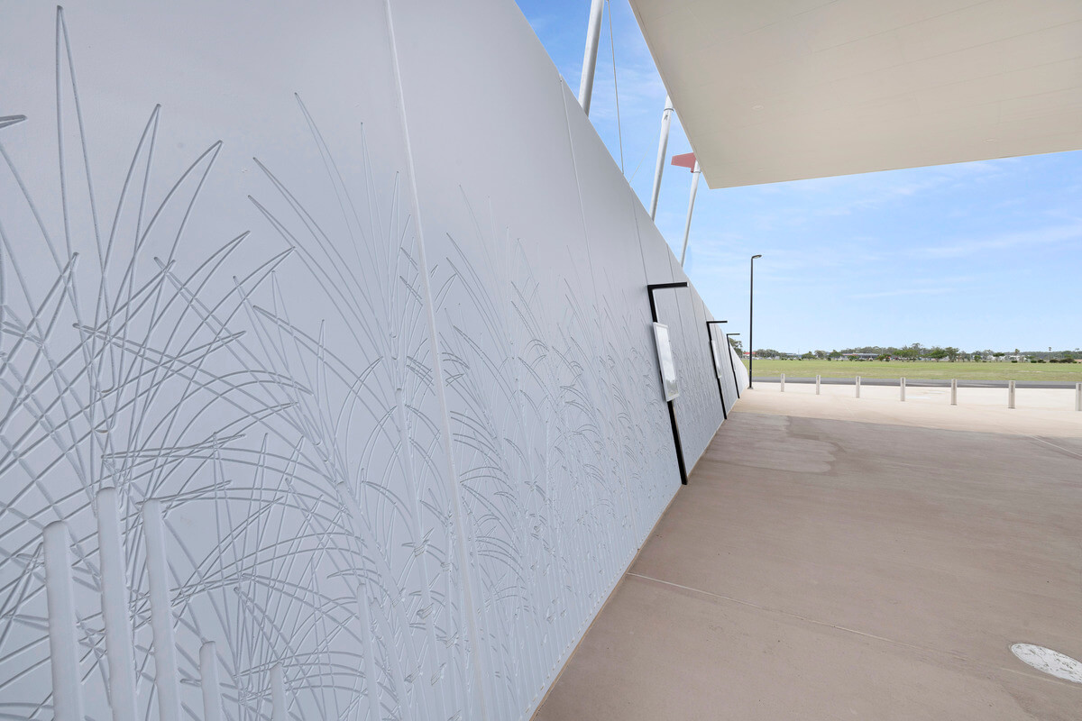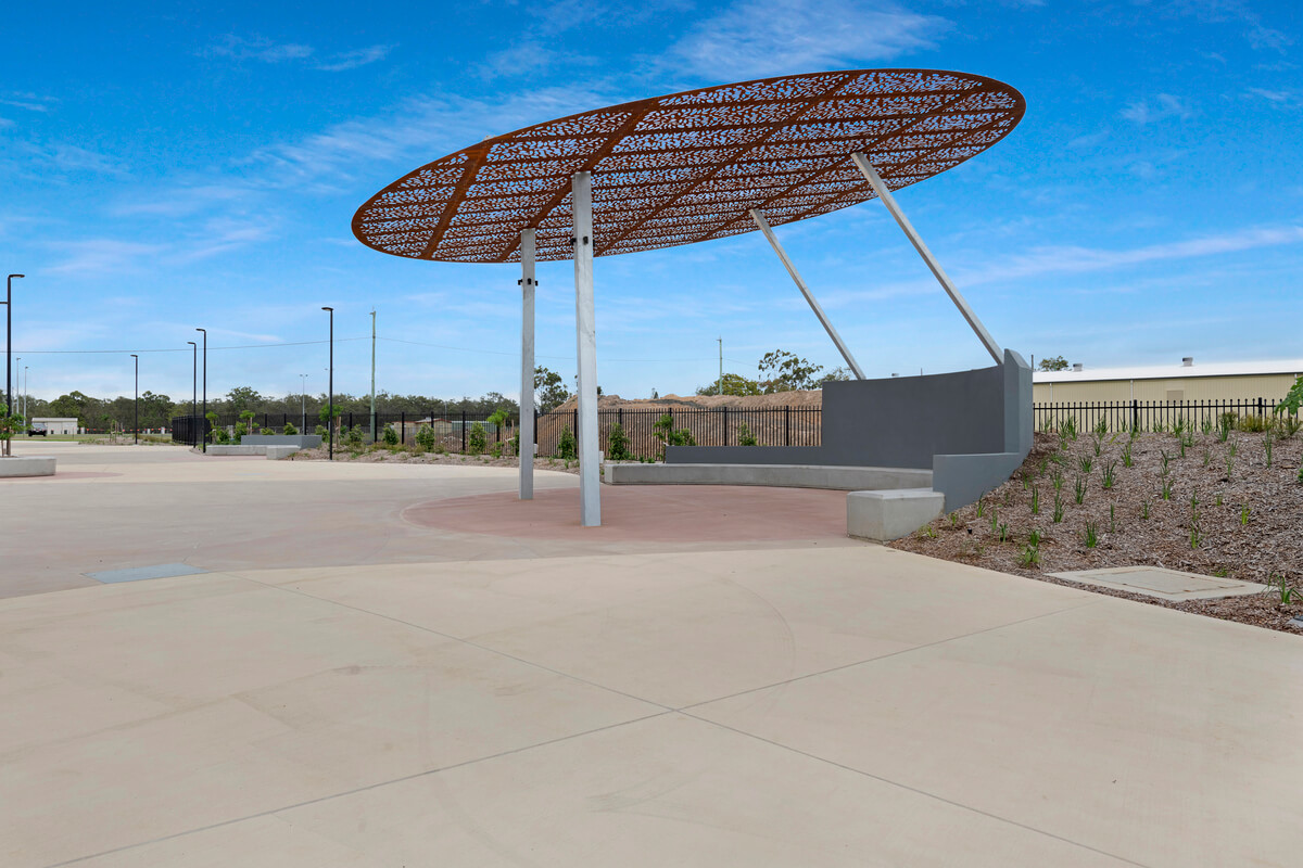 Extensive concrete paths and landscaping link the Entry Plaza to the Main Pavilion. Coloured concrete was used to further enhance the concourse, with semi-circular concrete seating positioned proportionately along the path. A circular Pergola made of laser cut Corten Rusting Steel is situated between the new Entry Plaza and Main Pavilion