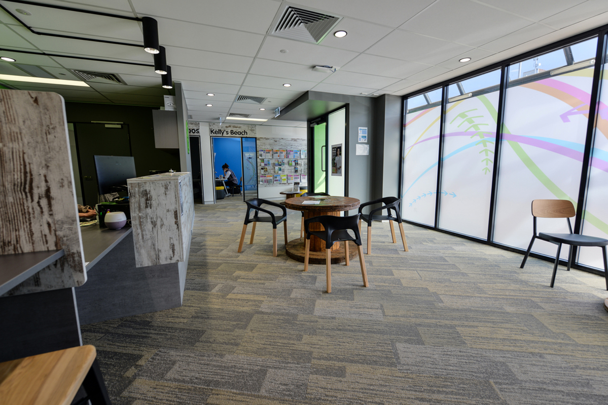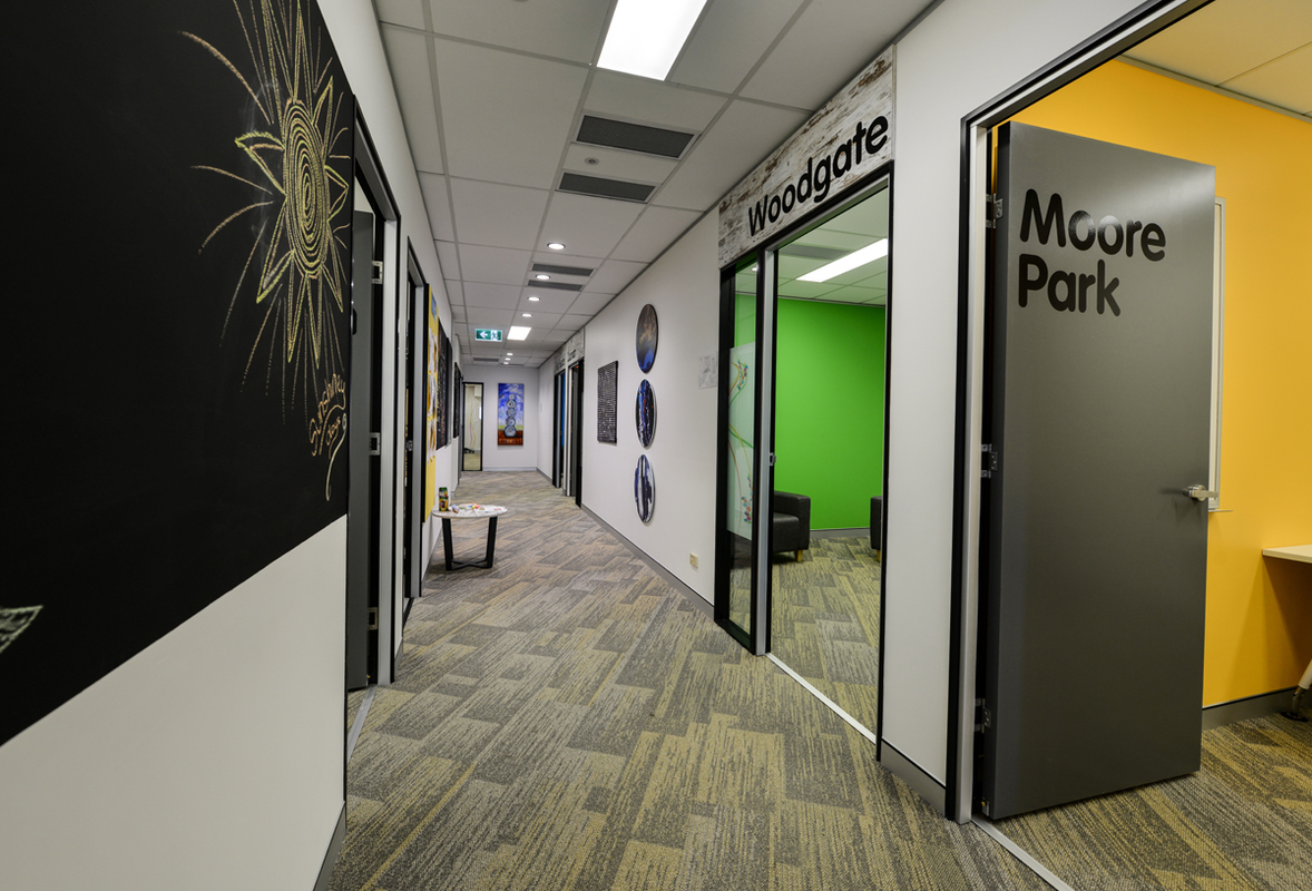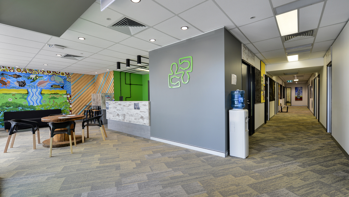 Contemporary artwork created in situ by local indigenous artists not only adorns the walls but also creates a visual reference to traditional land custodianship. To further youth engagement, reference is also made to the district in general, with consultation rooms named after local beaches, rivers and streets. This signage is a focal point throughout the tenancy as well as serving the purpose of room identification without the traditional clinical names.