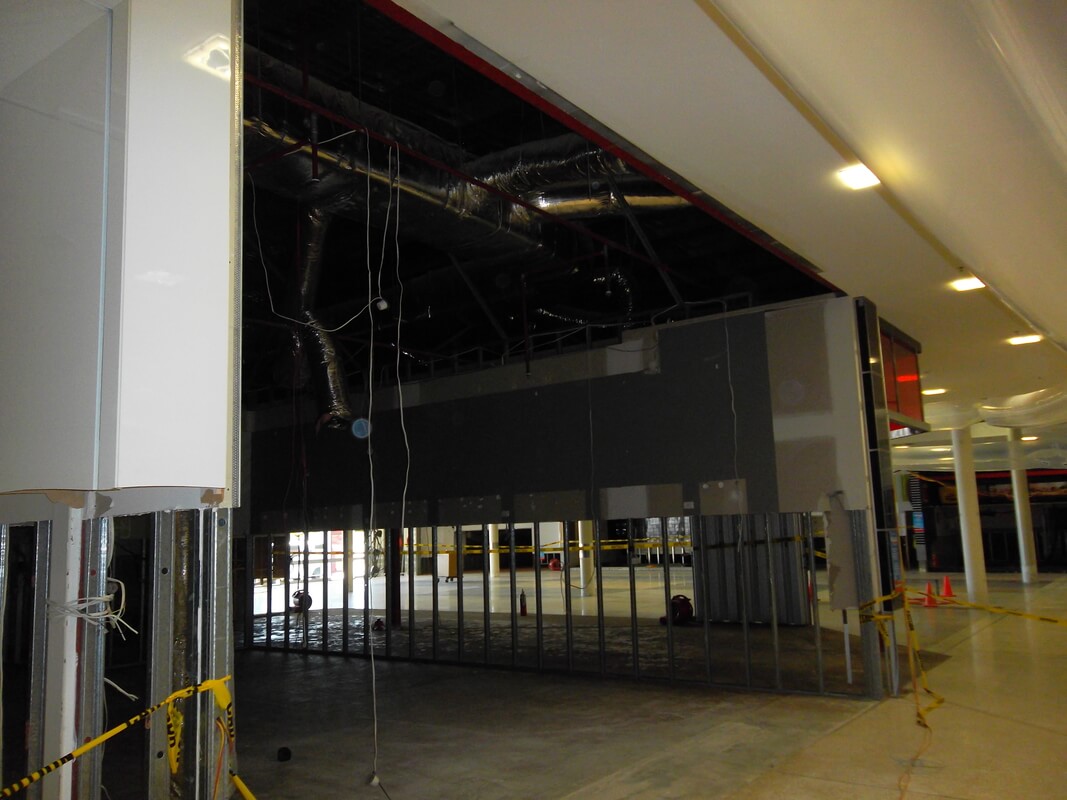 The threat of mould, not only in physical damage to materials, but also to the health of each person working within the centre, created a sense of urgency. Once each tenancy was de-fitted, our workers commenced the removal of all wall sheeting to heights ranging from 600mm to ceiling height. As the damaged materials were removed from site and the centre cleaned as thoroughly as possible, the drying process began.