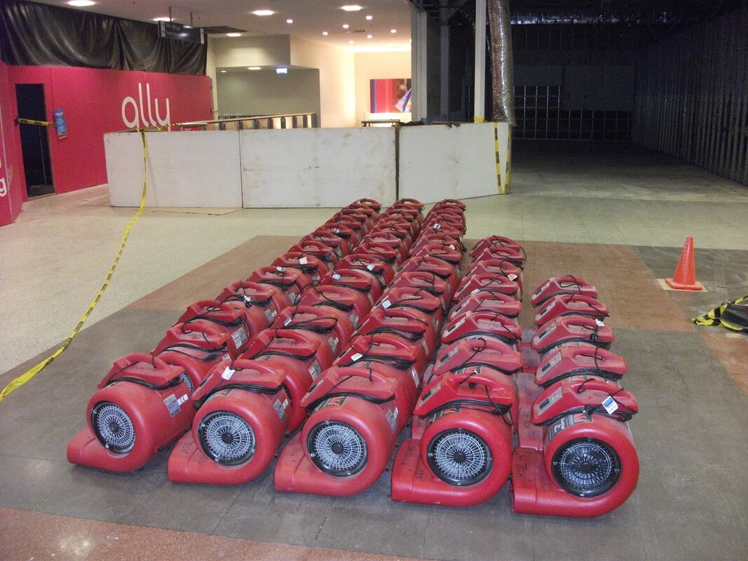 100s of metres of plastic ducts and 360 fans were installed by specialist contractors to distribute warm, drying air throughout the centre. Fuelled by gas and electricity, the desiccant drying units reduced the humidity levels over four weeks, allowing the centre to dry and halt the growth of mould. With an air temperature of 35°, working within the centre was challenging.
