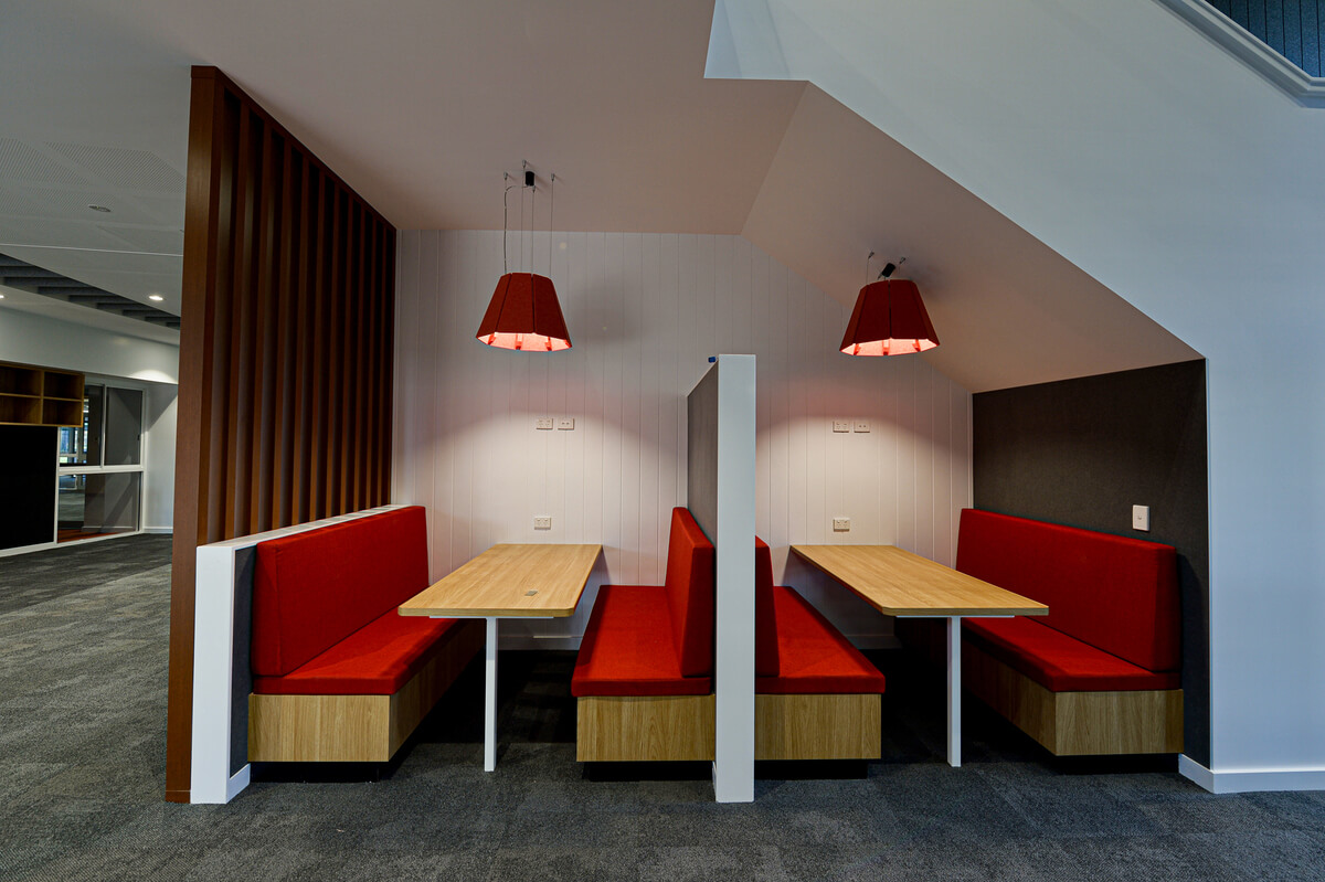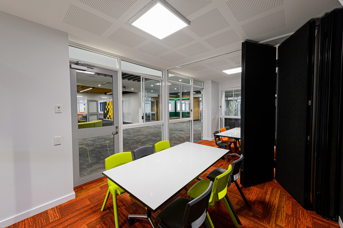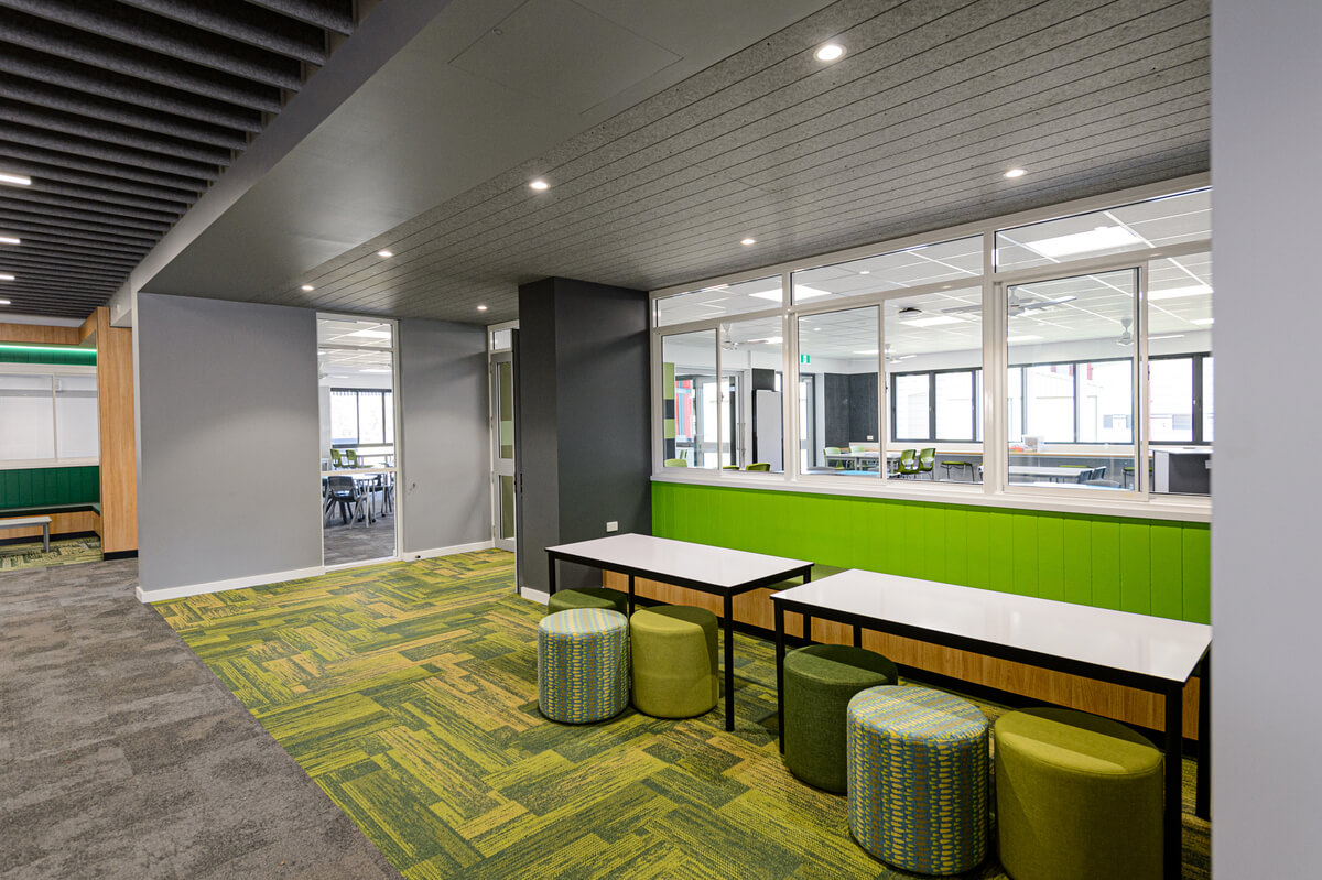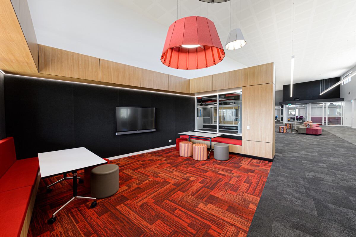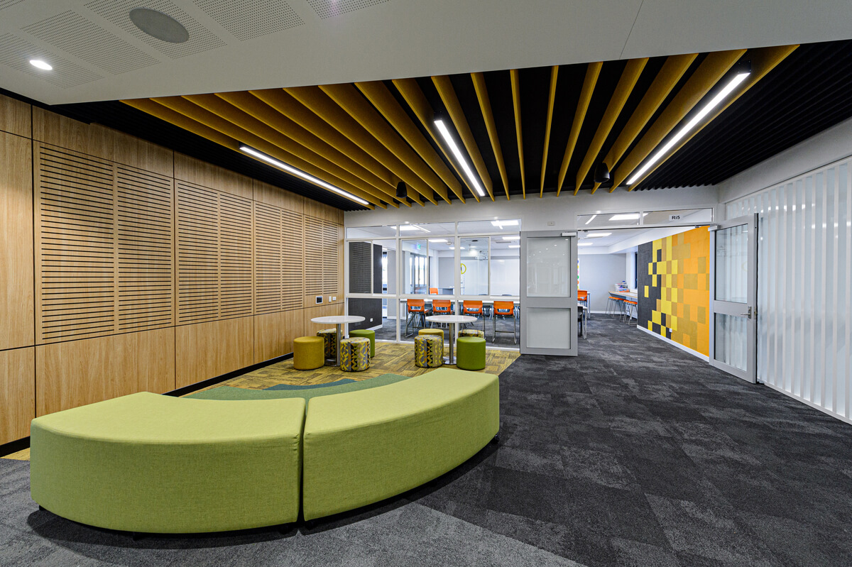 Stepping into the main entrance of the Waterford Building, you are instantly impressed by the architectural ingenuity that welcomes you. To the left of the main entrance is a tiered learning area with acoustic fins suspended from the ceiling above big ass fans to circulate air. A ceiling mounted Projector screen projects onto the wall in front of the tiered auditorium above a large whiteboard below. Smaller wall mounted whiteboards are mounted on each level of the tiered learning space. Slotted laminated panels adorn the walls on one side of the auditorium, while the other side is decorated in colourful Autex panels further enhancing the rooms’ acoustic properties.