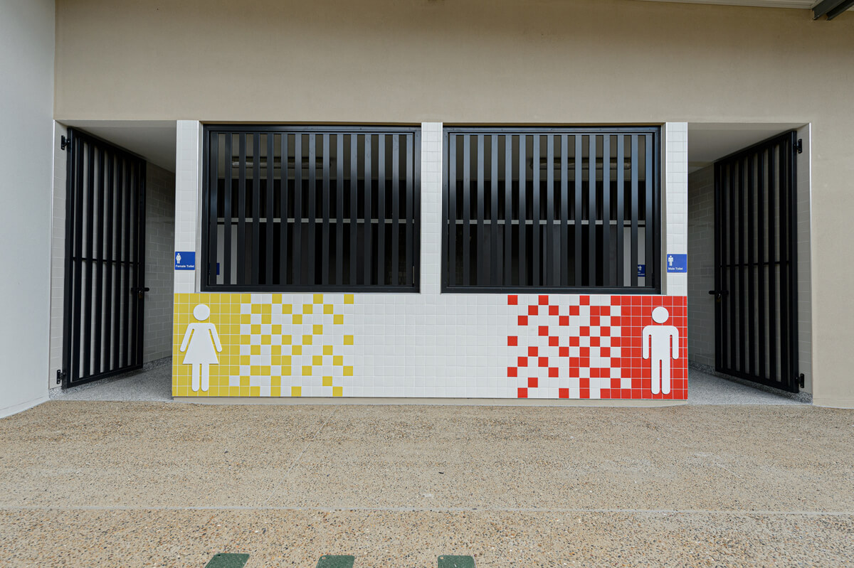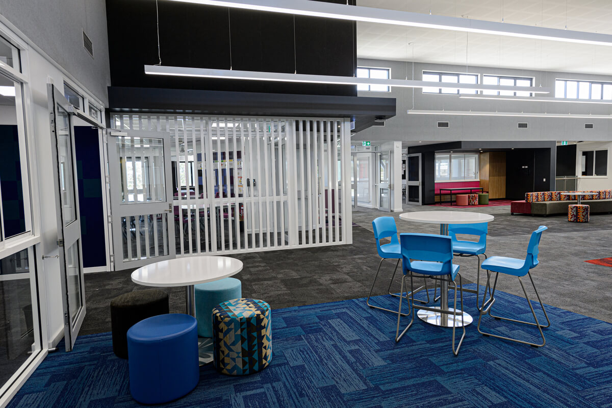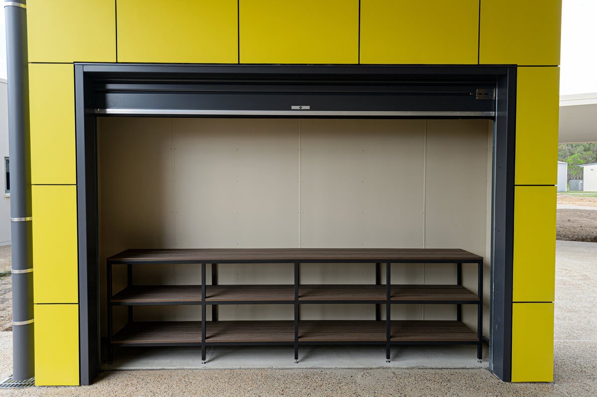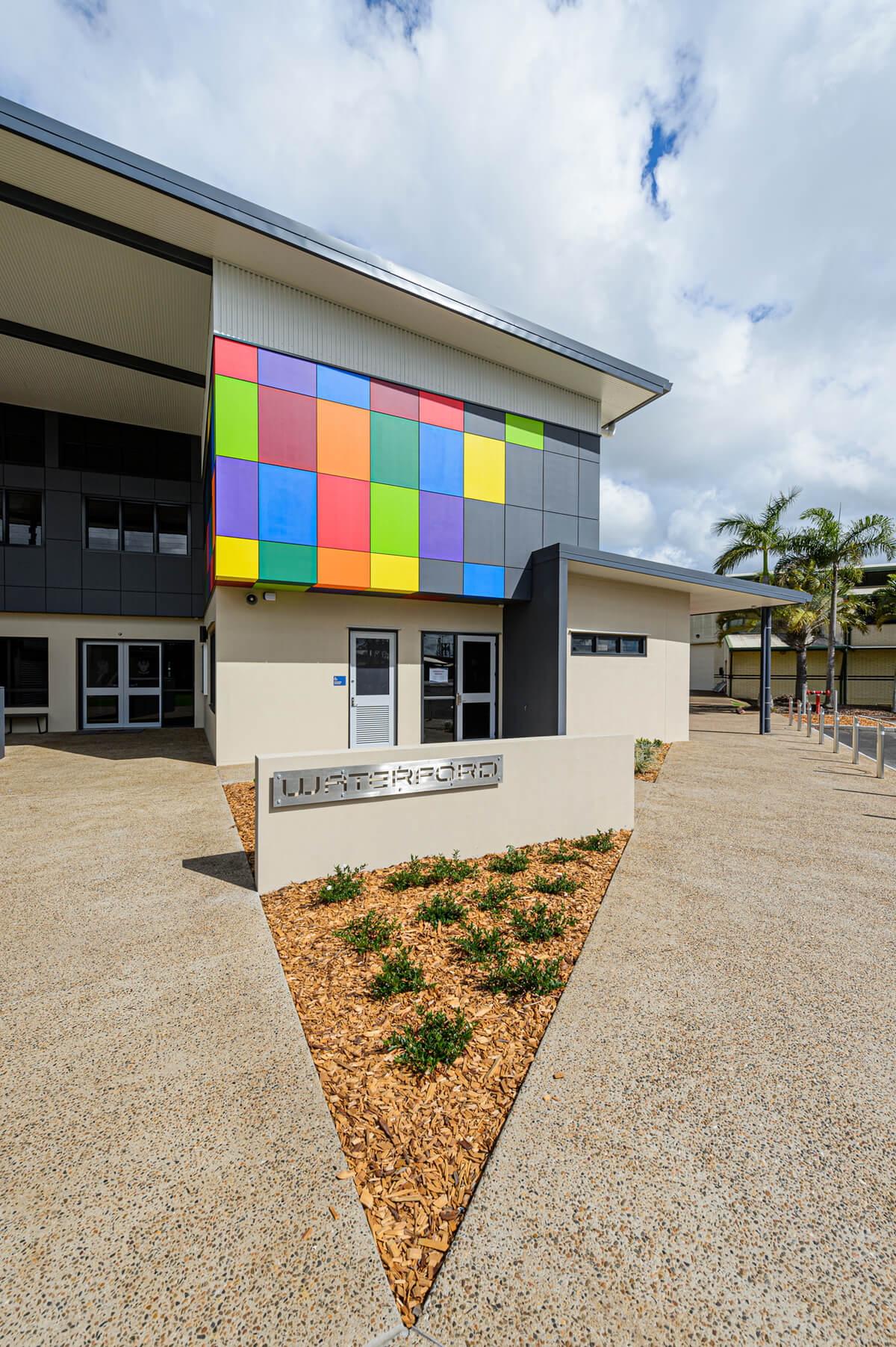 The Waterford Building is Shalom’s first flexible learning environment. Built from the ground up with multiple levels of suspended concrete slabs, the external of the building utilises a combination of rendered concrete block and metal stud frame external walls clad with colorbond and Exotec Cladding brightly painted in the School’s House colours. External soffits are clad with minirib colorbond sheeting and the use of Solair Aluminium Awnings and powdercoated aluminium screening to the western and northern side of the building enhances energy efficiency by minimising the amount of direct sunlight and heat permeating the building. External bag racks constructed of powdercoated steel frames and Urbanline Tracito Decking secured in enclosed structures clad with Exotec cladding with colorbond roller doors are situated around the building for the storage of Student’s belongings.